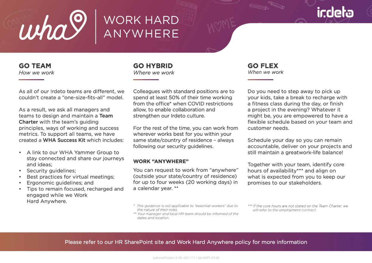 At Irdeto, when it came to the shift in working style and routine, we wanted to ensure that this would be the best approach for not only our company but most importantly, our employees too! In this blog, we’ll explain our new #WorkHardAnywhere program and what it means for us.